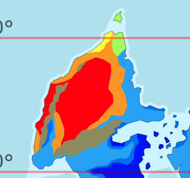 Regions Southern Range (Sotonic, many more) Western Range Interior (Biiraic) Hot Desert Hot Steppe West Coast Hot Desert (foggy) Hot Steppe (West) (foggy) Tropical Savannah Tropical Monsoon? Hot Steppe (East) East Coast (Sakrat) Tropical Monsoon Tropical Savannah Humid Subtropical (Pkwak) Cold Steppe Mediterranean (Pkwak)